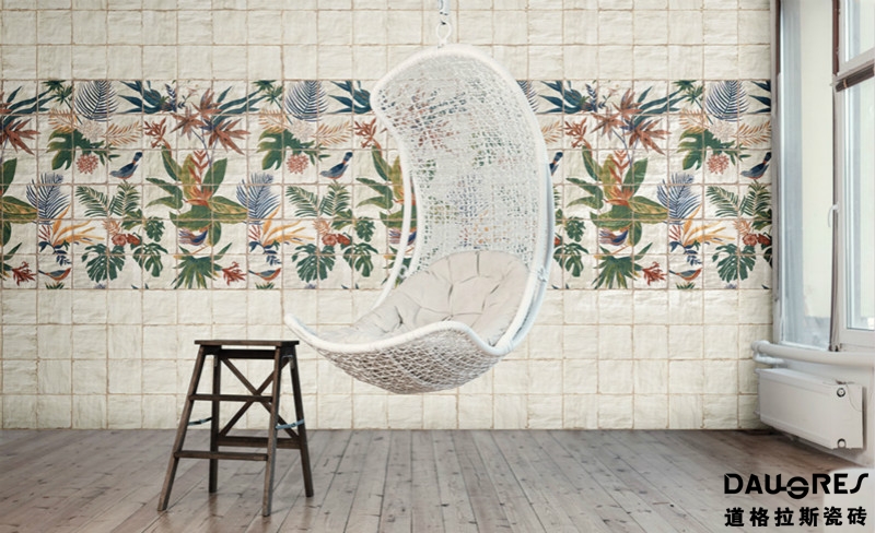 Tropical styles areonce again gaining ground in the design world. An almost basic white tile iscombined with an exuberance of color and the freshness of a detailed mural,complete with illustrations of exotic plants and birds with colorful plumage.Fresh styles from companies such as Mainzu give spaces an air of happiness and tranquility.